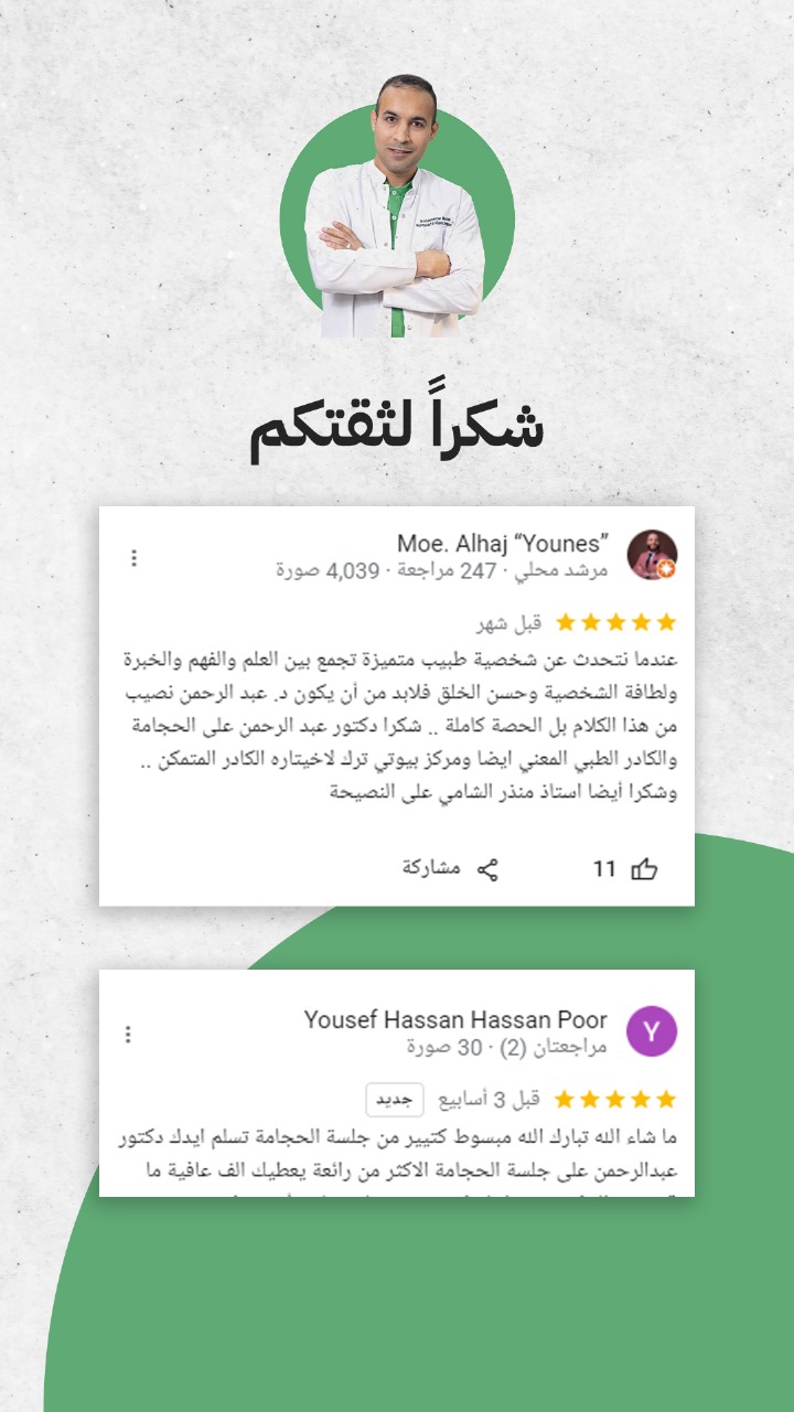 (Muhamed Eldaidamoni)⭐⭐⭐⭐⭐ خلال زيارتى الاخيره للمركز لعمل الحجامه ما شاء الله خدمه ممتازه جدا واستقبال اكثر من رائع دكتور عبد الرحمن متخصص الحجامه ما شاء الله ما بخل عننا بأى معلومه ولا اى استفسارشكرا جدا ليكم ويده جدا خفيفة ما تحس باي الم وما شاء الله عنه فاهم شغله صح انصحكم تجربونه واكيد بتدعولي