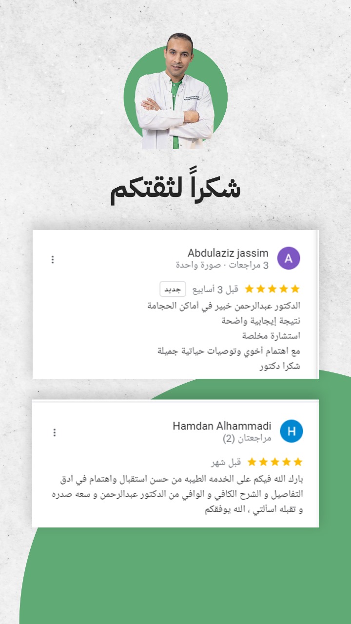 (fawwaz fraij)⭐⭐⭐⭐⭐ تجربه رائعه جدا جدا مع الدكتور عبد الرحمن المركز نضيف خدمه 5 نجوم الدكتور بشوش ايدو خفيفه. بقدم النصائح قبل و بعد الحجامه الأسعار مناسبه للجميع انصح الجميع يعمل حجامه عند الدكتور عبد الرحمن بإذن الله راح التزم مع المركز كل شهرين لازم يكون في زياره والشكر الخاص لدكتور و جميع العاملين في المركز